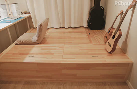 由于家里不大,所以每寸空间储物都很重要。次卧做了榻榻米,地台是松木的,一米八乘两米,既能工作又大大增加储物空间,平时如果有客人,铺上垫子还可以当床,对于小户型再实用不过。memedoo的先生会在这做皮具弹吉他,给他的爱好留出安静小空间,而memedoo在这看书学习加班。