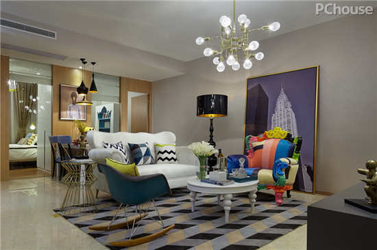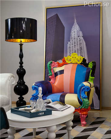 在精英灰的底色之上,缤纷的色彩如一串音符洒落其中,欢呼着,雀跃着,营造出充满活力与激情的氛围。解构主义的彩色扶手椅,以强烈的艺术装饰性成为最大亮点;散发复古气质的黑色落地灯、茶几与白色简约沙发,无界的混搭碰撞出充满张力的视觉感。