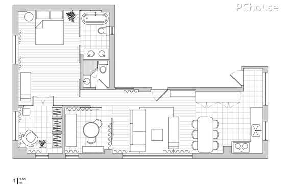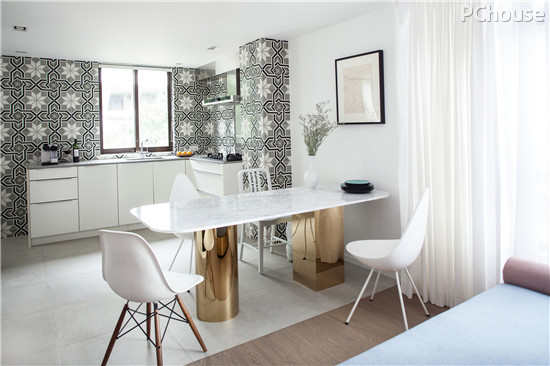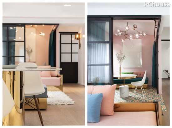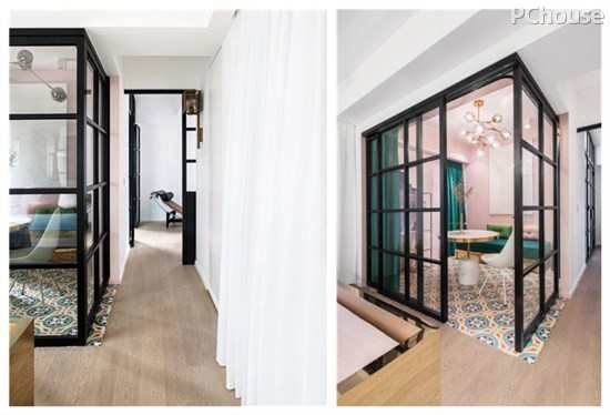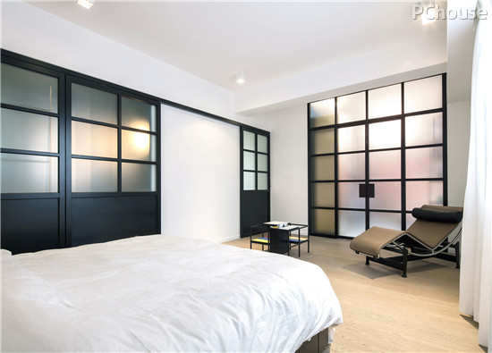 在空间的 改造上,设计师通过移除和重建原有墙体,便使得该室内在视觉上更加开阔。通过用玻璃和钢铁推拉门替换划分公寓空间的墙壁,使得自然光可以在房间之间游走,充满改造后的公寓。