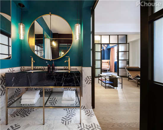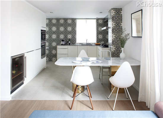 同时,厨房、书房、步入式衣帽间和主卧使用丰富的粉彩和深宝石色调,与图案瓷砖雅致搭配,使得核心居住空间与延伸空间融为一体。