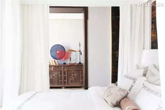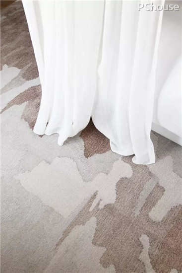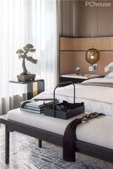 二层主人套房大面积诗意漆画、抽象提取云元素地毯、写意留白床幔,书就深邃辽远的东方传统意蕴。