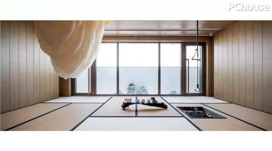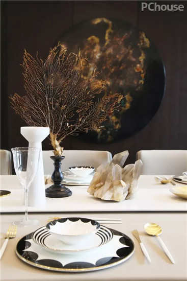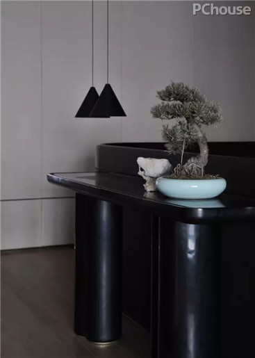 穿过客厅与餐厅的交界通道,到达另一个景致——茶室。茶室内当代装置仿若倒山水又似云萦绕与外部留白墙面山石绘就的水墨画卷,虚实之间无限延展出去。这个在灰空间里营造的冥想禅境与外部摩登的壮阔景观,中国美学鼎盛时期的宋人风骨与传承至今的老上海的有礼有节在当下时空交错。