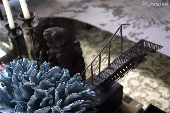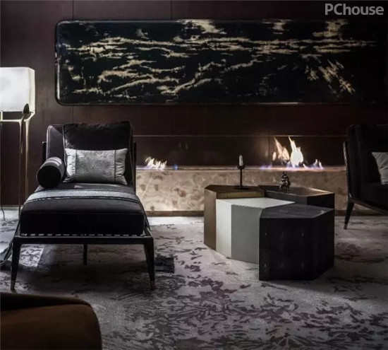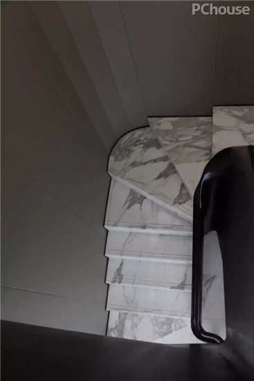 贯穿一二层空间的楼梯成为嵌入空间的一个大型盒子,是空间横贯和纵贯的连接点。盒子内外做了精致区分,楼梯外部为深色木作,内部运用高级灰皮革包裹,老上海优雅考究的细节贯穿始终。进入二层,到达起居室,有着东方水墨意境的大漆异形案几与当代素色龙纹沙发之间,书写人文气质。