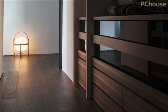 前厅右侧也是窗棂,木条是相同的分割,后方是主人生活的私领域;左侧可以看到面贴板岩柜面一盏圆形壁灯亮着,经过后就是开放的公领域。