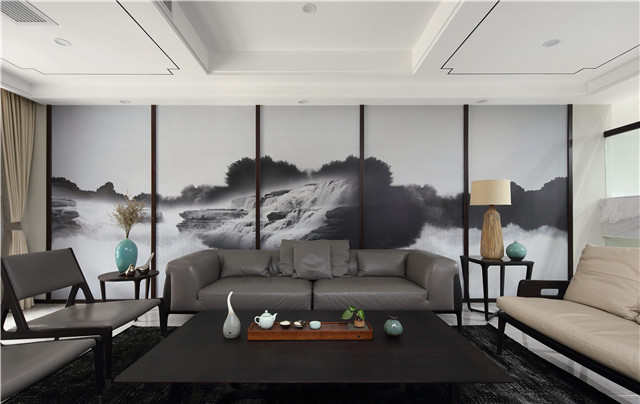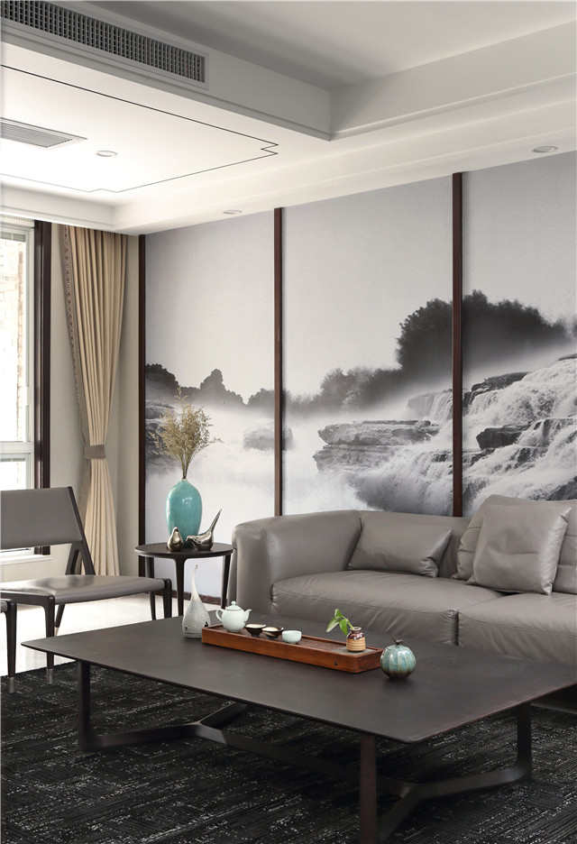 带有立体感的山水画、简洁且高品质的暗灰色皮质沙发、家具与墙壁间的线条搭配的美感,仿佛模糊了室内室外的界定。坐在这样的客厅里,山水高墙下,品一壶茶,触摸手中的瓷器,仿佛带上了时光的味道,大有脱迹尘纷之感。