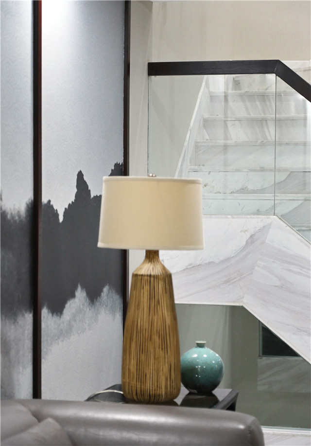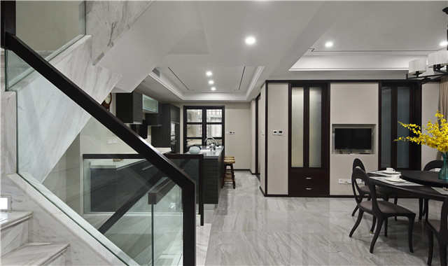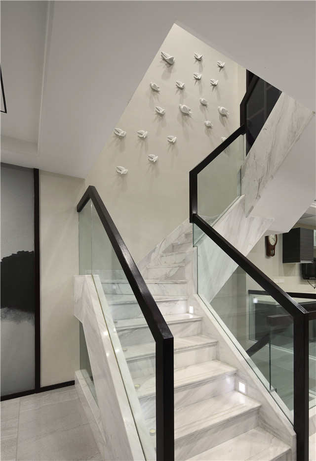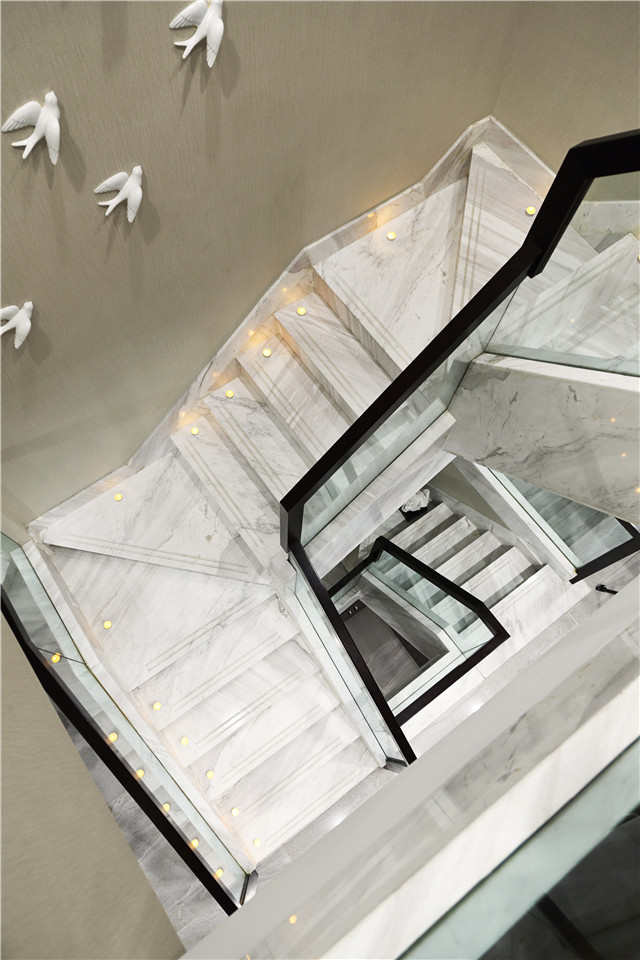 楼梯间简洁却不平凡,石材的运用非常大气,经黑色楼梯扶手勾勒,点、线、面的结合在温婉端庄的空间中突显出来。