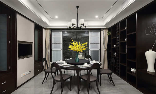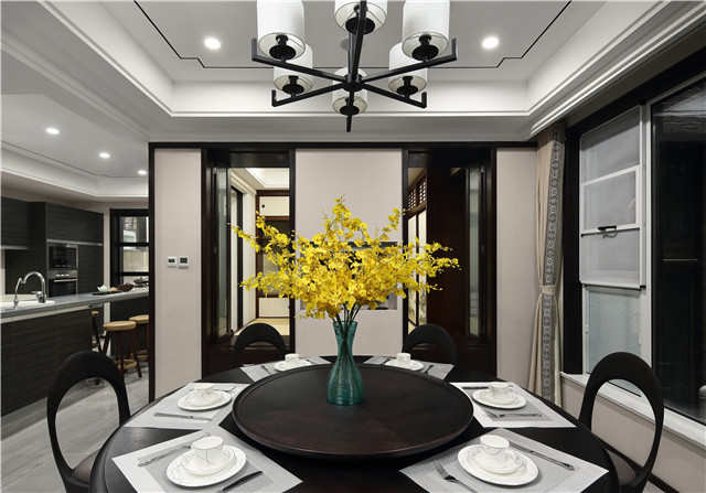 餐厅虽然以深色系为主,但一抹明黄色带出一份温情,夜幕降临,点一盏明灯一家人共进晚餐,渲染浓浓的亲情。