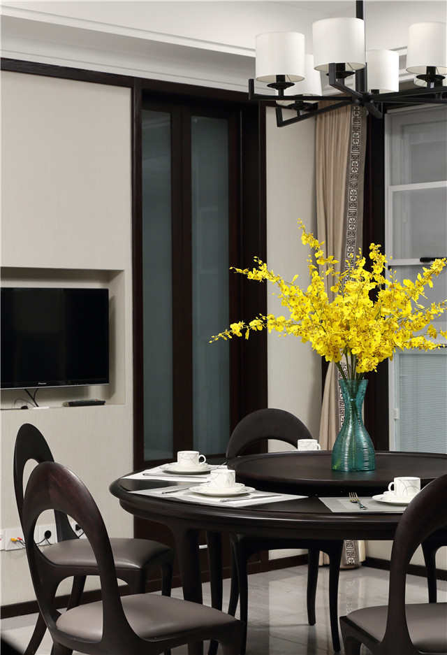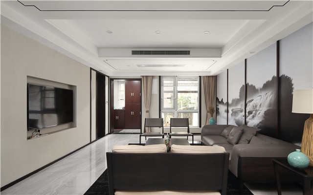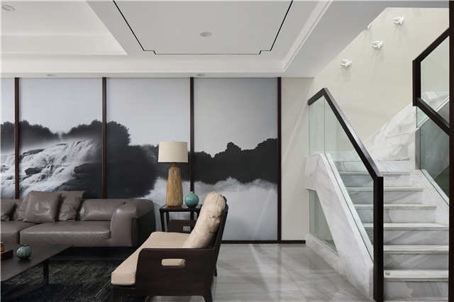 客厅的背景墙,采用了泼墨和水墨晕染的手法,表达出一种江南水乡的韵味,忘却城市中嘈杂的氛围,让一家人体会到江南水乡的宁静。