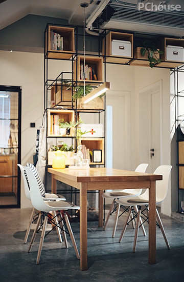 客餐厅的主力收纳就靠一整面的的钢筋柜体,不同的位置摆上不同的盒子,功能变化及其灵活。