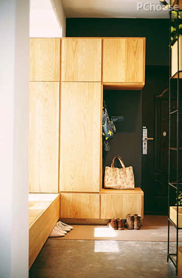 玄关处用的是顶天立地的鞋柜,把左手边开发商留的鸡肋入户空间改成了一个多功能区域。