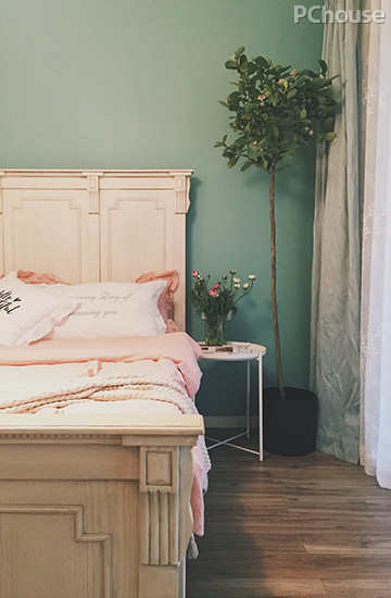 卧室蓝绿色的背景墙给人的感觉很温和,很多人问到它的色号:多乐士50GG,43/213。