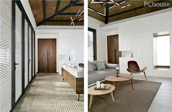 玻璃门框内置了柚木百叶,从木百叶过滤进来的光线让室内空间随着光线的变化渲染出流动的光阴肌理。