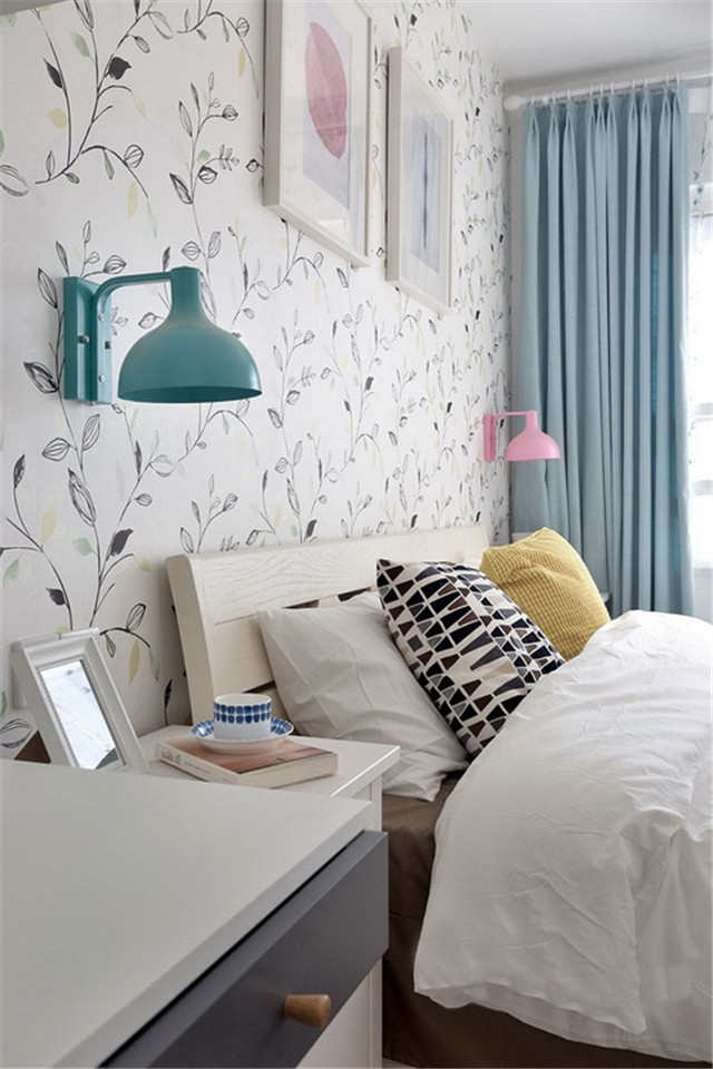 进入卧室,给人的第一感觉是清新又甜蜜的自然风情。卷草的墙纸搭配纯色的床单和窗帘,营造了一个舒适静谧的休憩氛围。