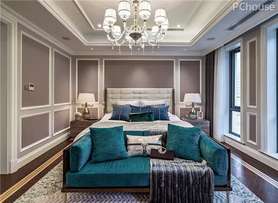 主人房位于三层,通过会客室进入卧室,卧室运用灰色系亚麻面料窗帘,搭配充足的光线穿透房间,显得自然而和谐,美感骤然提升。沉稳内敛的色系与充满温和气息的织物营造出一个温馨和谐的家居环境,予人一种优雅从容的气度。