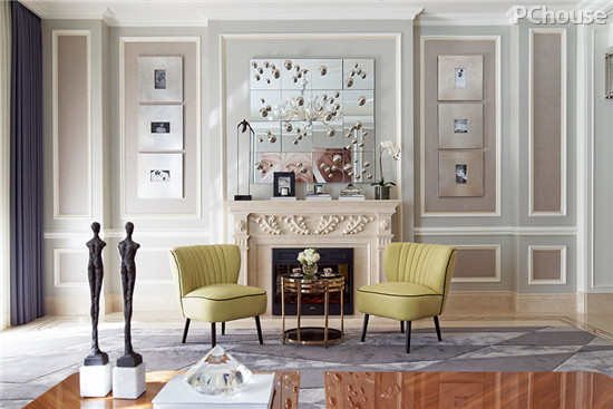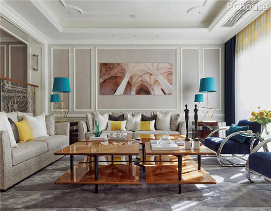 客厅里浅灰色搭配亮黄色的沙发、组合式的复古摩登茶几,唯有时尚的高冷系地毯才能压住这股低调而霸道的气场。