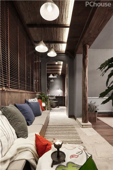 编辑点评:软塌区域摆设着各式各样的抱枕,从色彩上与古朴的木材以及绿意盎然的盆栽形成了鲜明的对比,为空间增添了一丝活泼的气息。当慵懒的晨光撒入室内,整个空间开始变得明媚,小日子从容而富有诗意。