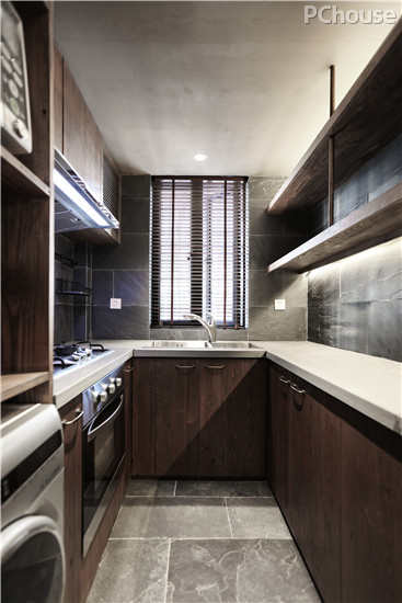 编辑点评:厨房区域是谱写欢乐生活交响曲的一个场所。深色的木板和砖面,与极具现代气息的厨具毫无违和感地融合在一起,让空间变得更有张力,也让人看到更多关于生活的可能。