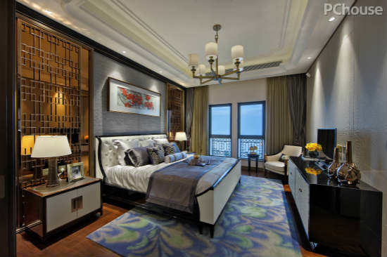 编辑点评:别墅共有四间睡房,一层的老人房以浅灰色铜钱壁纸与米色的床尾背景墙形成强烈对比, 一幅红色为基调的国画成为整个空间的点睛之笔,搭配浅紫、浅绿色的花瓣地毯,代入一个恬静典雅的私厢。