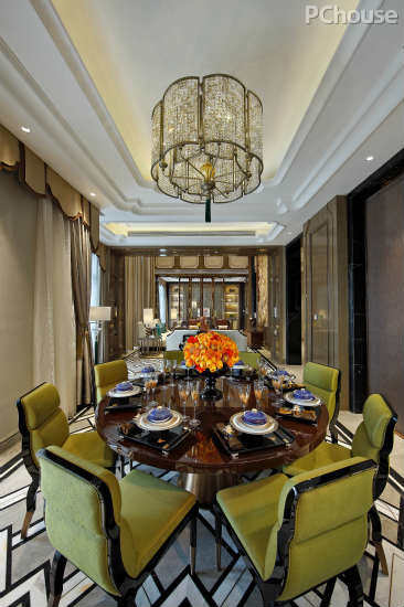 编辑点评:餐厅毗连客厅,在圆形水晶吊灯的映衬下,酒红色的圆桌和浅绿色座椅,倍感雅致;推拉门巧妙地隐藏了咖啡色原木纹装饰面板的厨房,同时为互动创造了无限可能。