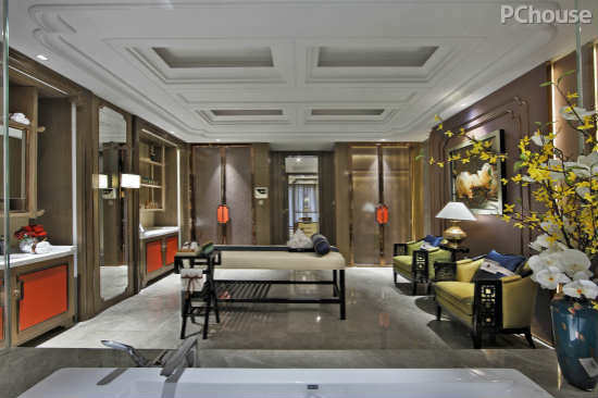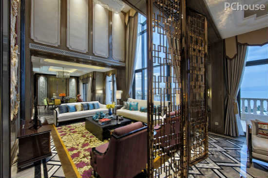 编辑点评:巨大的水晶吊灯“倾泻而下”,浅栗色墙身与墙面一幅两层楼高的巨幅木雕——双凤牡丹的搭配甚是恰当,一下成为整个空间的视觉焦点。而传统云南民族特色的刺绣抱枕和拥有“金属工艺之冠”之称的虎相斑铜,寓历史文化于陈设之中,演绎出王室贵族的生活气息。