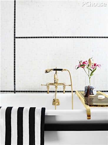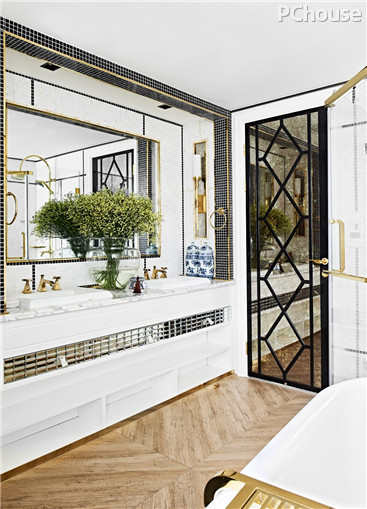主卧的大床床头用米色真皮软包,而卫生间的主材是黑白相间的马赛克、香槟金不锈钢、白色大理石已经镜面马赛克。