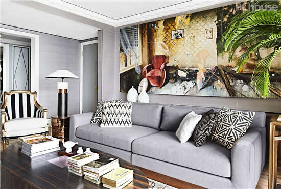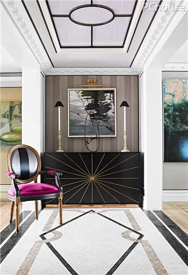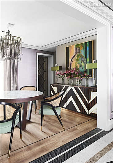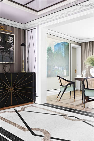 在这个作品中,设计师运用了许多高级的材质:大理石马赛克、木地板衔接处的黄铜条、纯丝质的壁布、黑色丝绒的线条、真丝的窗帘、烤漆木门等。
