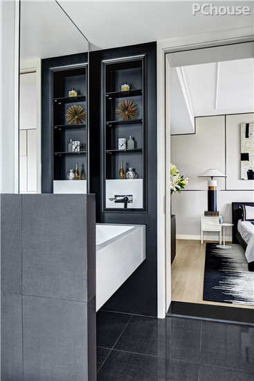 在公寓的私人空间里,你会看到Baptiste给主卫特别设计的一款洗手台,这是由整块黑色大理石打造而成,搭配同样定制的玻璃镜面,奢华优雅。而常用的卫浴用品则被“藏”在镜子的背后。龙头是全自动感应控制,而公寓中所有的电器灯具开关也是用了最先进的科技,智能感应。