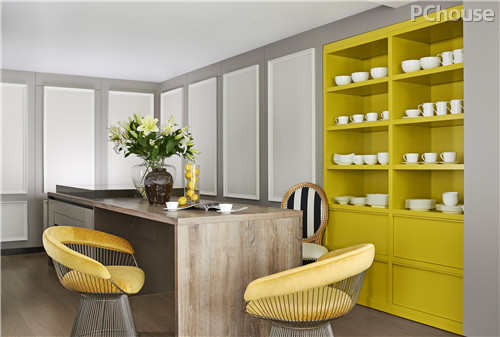 现代风格的厨房里有色调明快的黄色橱柜和大理石料理台,在这里Baptiste也使用了和玄关处相同的法式线条,墙壁就被分隔成大小均等的几块,给置身其中的人带来强烈的立体感。