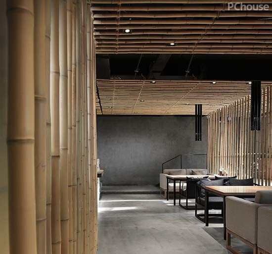 由外立面的竖向线条延伸至主入口玄关,形成侧向分流进入一层茶歇区,将竹用单一纬度的围合方式形成半空间限定区间,茶座布置在竹篱一侧,形成二方连续式的空间关系,并由此聚合成一层的功能核心—“篱园”。