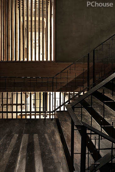 此时,围绕着“篱园”的顶面竹篱正发生着纬度关系的转变,并引导性的将吧台、出品、服务动线等功能串连起来,与之前的功能核心形成咬合关系而最终指向通向上层的垂直电梯。