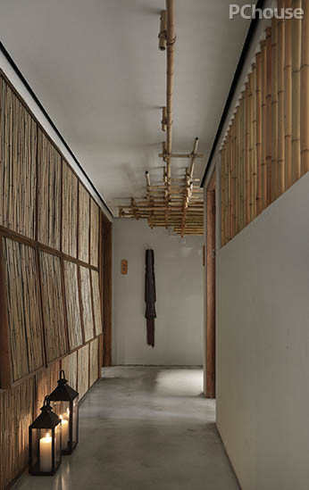 于是乎,存在于黑暗过道背光面的上部,并由竹篱叠加其中而形成的双层采光界面,充当了瞬时解放黑暗的勇士。而顶面转折处被雕塑化处理的局部搭建,正是在空间获得光的解放后所表现出的肆意姿态,有效的软化了相对硬朗的空间对接。包间依旧拙朴、留白。