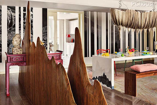 屏风的功能是改变人的行为模式,进来之后要迂回地进到这个客厅里面。山水同时也是一种移步易景的概念,就是走的时候其实整个的空间是在变化的,看到是虚跟实之间的结合。