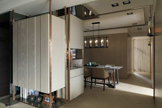 编辑点评:将门片隐入墙面线条采一体成型规划,简化庞杂的空间视野,留白空间的美好余韵。