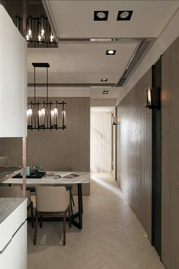 编辑点评:位于公私领域动线交会轴心的餐厅,改以开放式规划的餐厨区藉由中岛吧台区分空间属性,从立面延伸至天花的镜面亦放大空间,呼应客厅镜面手法。