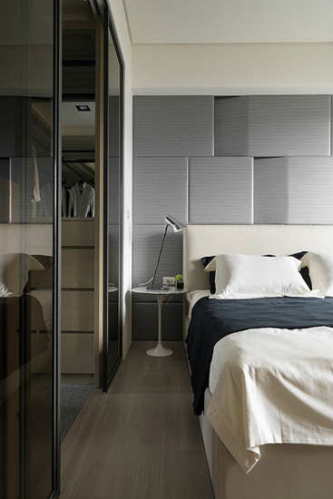 和煦的日光探入,近树远山的绿意伴随而来,在柜面灰镜投射出灿亮丰富的空间层次,重新拉整过后的格局,让主要活动的客厅坐落在临光赏景区,同时点亮开放规划的玄关段落。位于公私领域动线交会轴心的餐厅,亦打开厨房墙面加添中岛吧台采开放式规划,呼应客厅镜面手法,灰镜元素从立面转折接续天花延伸,增添多角度的镜射层次,更形放大空间。而主卧房中则另辟更衣梳妆区,完整收纳展放年轻女孩的大量衣饰配件。