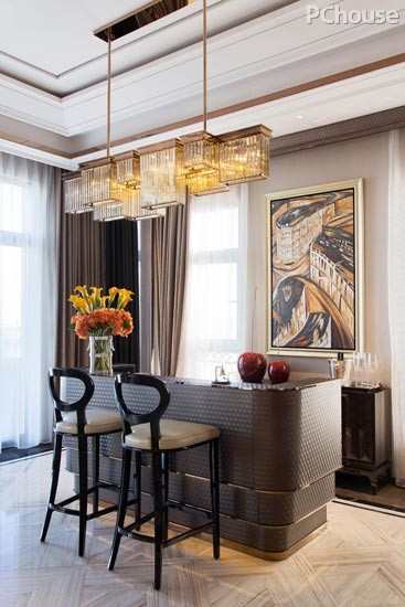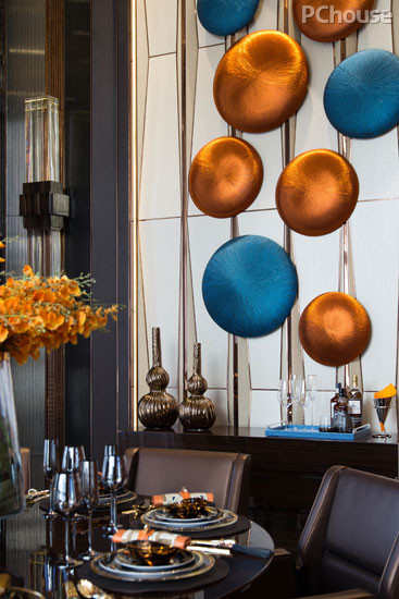 编辑点评:巨大的圆环形水晶吊灯倾泻而下,点亮了用餐空间,配以经典咖的真皮餐椅为点缀,呈现低奢、大气之风。用餐旁,以蓝与橙为主的强烈对比的陈设搭配,碰撞出兼具超现实与复古风味的视觉感受,表现出现代与传统的交错,寄予空间一种新的生命。