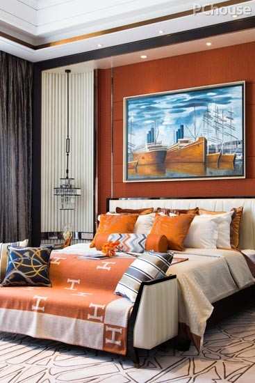 编辑点评:一盏现代床头吊灯的陈设,低调了整个空间浓烈、醒目的橘红,地毡上简约的白与床上家私相呼应,再配以背景的帆船油画,透漏了主人一往无前、无所畏惧的探索精神、自由洒脱的性格。