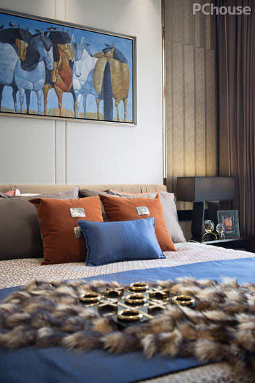 编辑点评:简约的黄棕色地毡提亮了原木地板的深沉,并与房内的光亮度相适应;空间以阳光、青春的蓝与橙为基础,缀以“马”为主体兼具超现实与立体的艺术画作,寓意屋主为“阳刚”、“雄性力量”的象征。