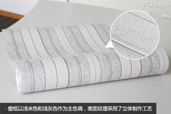 拆开薄膜后铺开壁纸,可以看到壁纸表面是以米色和灰色为主打的条纹状图案。细看之下,其花纹图案不是使用平面花纹,而是采用了立体制作工艺。用手抚摸壁纸,壁纸的触感微硬,较为厚实。