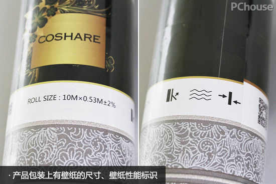 仔细观察,包装上还有壁纸的尺寸和性能标识,从尺寸标识可知,这卷壁纸长为10米,宽为0.53米,其长宽误差在±2%左右。性能标识则表明,这款壁纸能抗撞击、耐水性优秀、铺设时需错位对花。