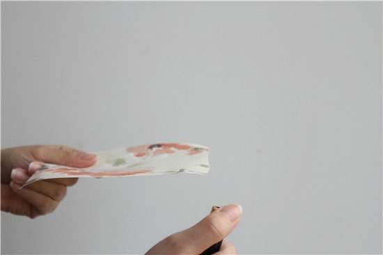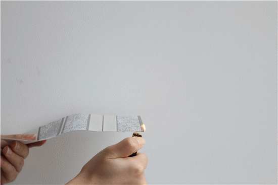 环保材质的壁纸燃烧时一般没有黑烟和异味,如果壁纸燃烧后冒黑烟、有臭味,则表明其为含塑壁纸,环保性能没有保障。我们以市场上一款水性壁纸为例,点燃时不会冒出较大的火苗,燃烧后不冒黑烟,证明其材质天然环保且不助燃,品质较为优良。