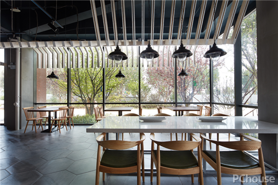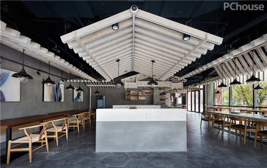 休闲餐厅独立于营销中心,保留原始结构以混凝土工业风为主,相对于营销中心,餐厅更多的营造一种放松、休闲的用餐氛围。