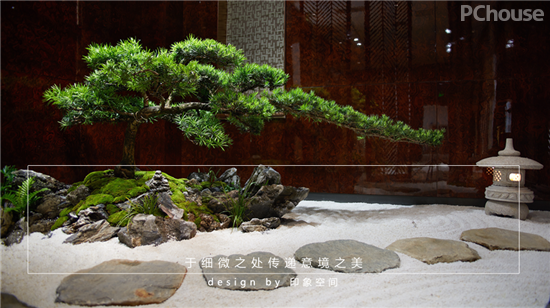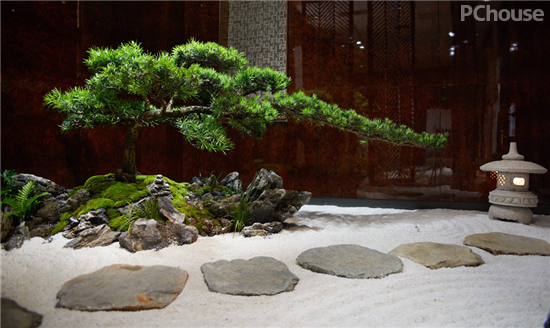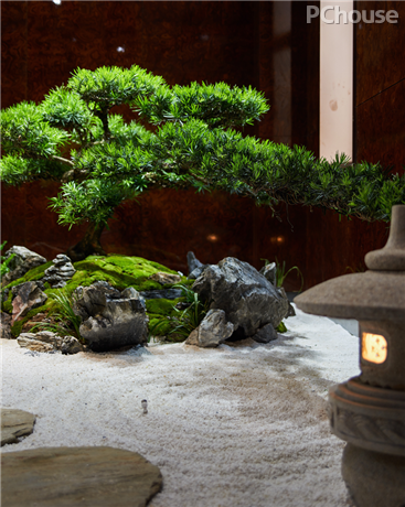 值得一提的是,走廊干景步道的景观软装,一个集观赏、生态、自然于一体的设计。小巧石笼、粒径不等的滩石,旱湿均可培植的苔草地被,有机地组合在一起传递古朴自然的审美趣味,让营销中心的意境之美浓郁几分。