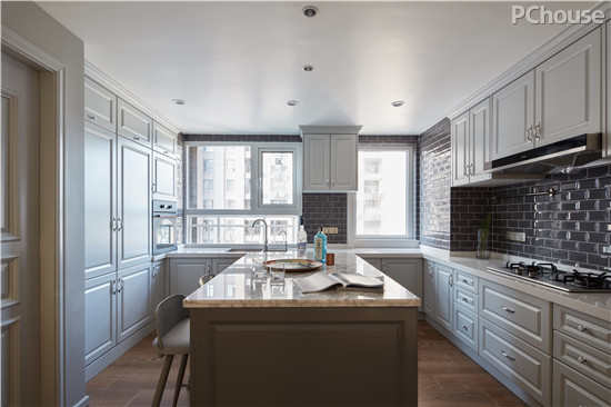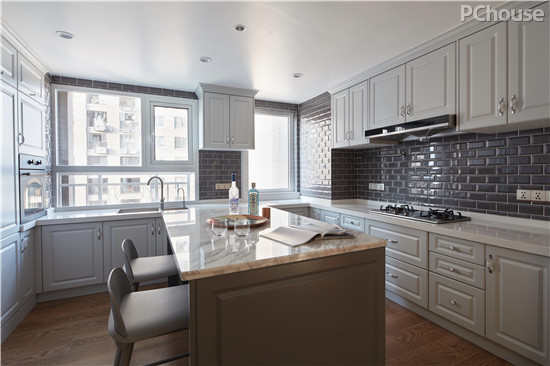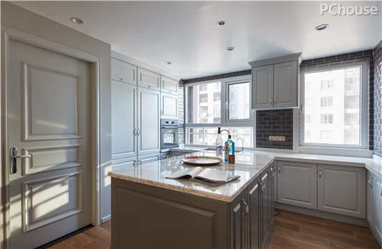设计点评:厨房采用U型设计,扩大操作空间,保证洗涤、烹饪、操作、储藏等功能有条不紊的进行。