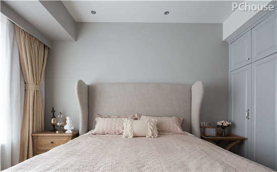 设计点评:麻艺床头、粉色枕套与卧室格调交相呼应,满足主人对浪漫的追求。原木柜上摆放着相框、灯饰、小雕塑… 它们仿佛在诉说、见证主人精致、有趣的旅程。