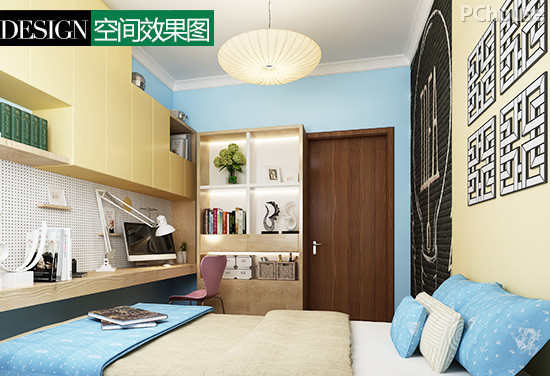 设计解读:儿童房的设计目前是以多功能的性质出发,没有像衣柜那样大体积的收纳容器,但基本的立柜还是可以保持空间的整洁。浅黄与浅蓝的搭配,有着一种说不上来的协调美;黑板墙的设计,则让纯粹的空间多了一分趣味与美感。