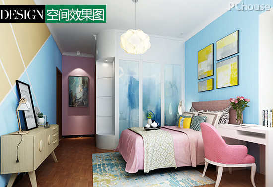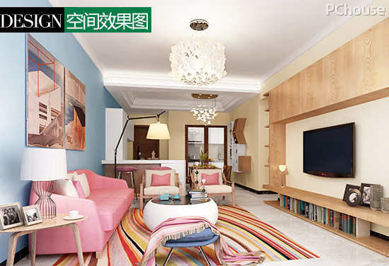 设计解读:客厅舒适自然的米黄色墙漆搭配自然的原木柜体,家的温馨感油然而生;加上羽毛吊灯的装饰,从造型上打破装饰线条的硬朗感觉。除了温馨的米黄基调以外,设计师还加入了天蓝色的墙面,粉红色的沙发以及红白流动的地毯色彩,以马卡龙般的甜美与清新,打造了一个充满着青春与活力的视觉效果。