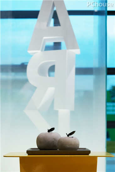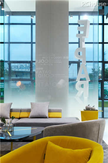 设计说明:落地玻璃也室外景色无缝连接,细看玻璃上还有英文字母的水印,E-PARK的字母组合成柱状,不统一的朝向展现自由意味。