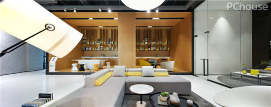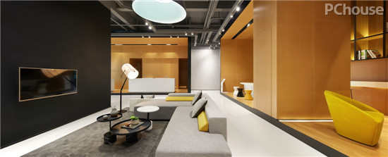 设计说明:淡洽区以简约的明黄色为主调,沙发则走高级灰路线,项目名称醒目地打在明黄色的墙上,logo的笔触设计强劲而有力。