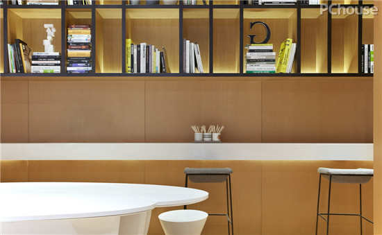 设计说明:书架下预留吧台的空间,简单的白色石板,配合灯带装饰,高脚凳就是几条铁丝加坐垫勾勒,不增加一丝一毫的冗余。